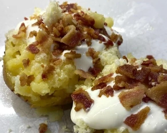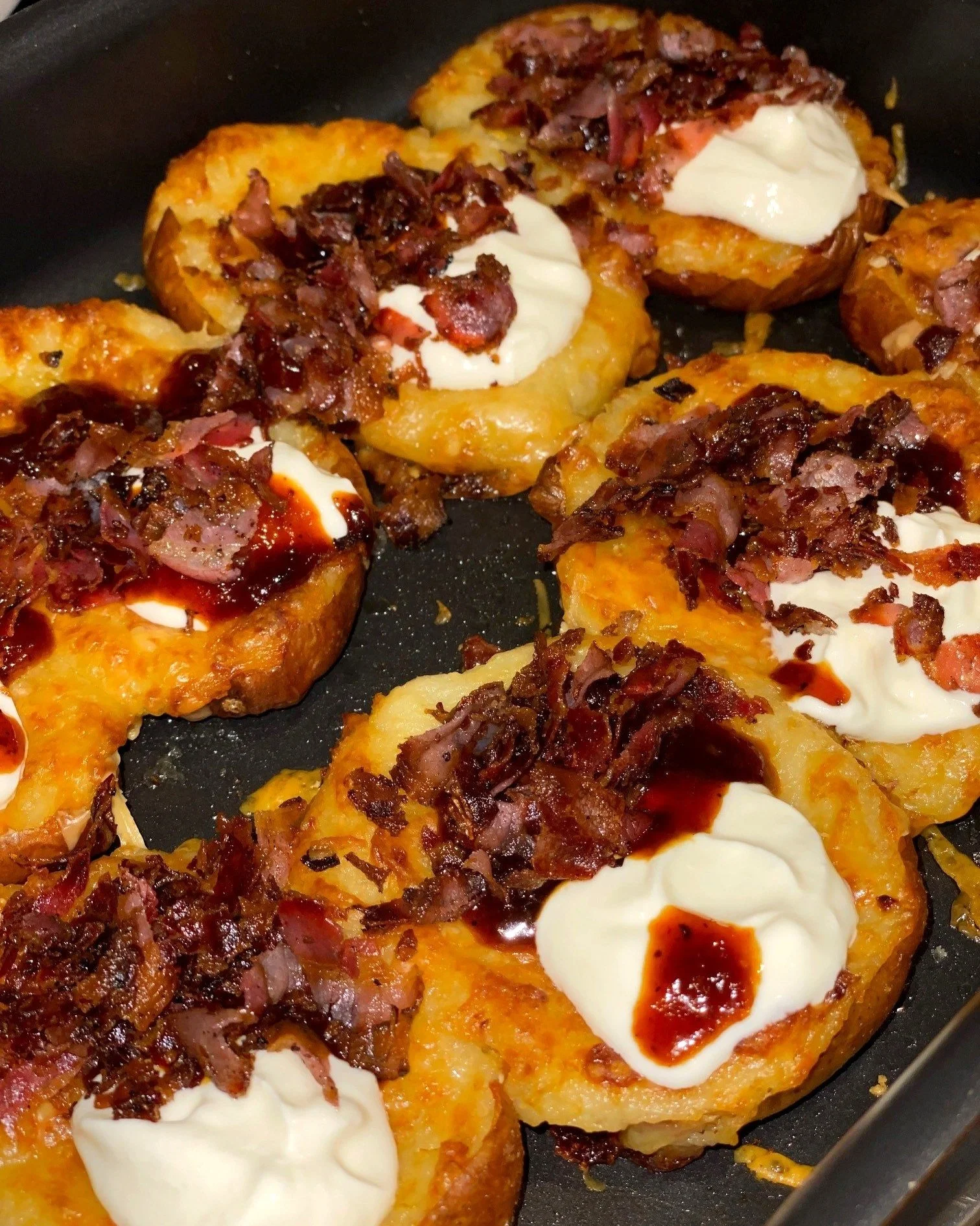 When you cut open the potato and smother with butter, don’t forget to season the inside of your potato. Top with the cheese, then ½ tbsp of sour cream per side and crush or cut the bacon up and put all over the top.