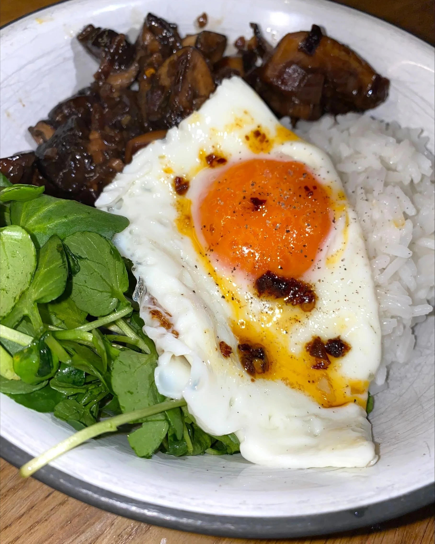 When your egg white is set take some of the buttery oil in a spoon and pour over the top of the egg yolks so that any white just sets but your yolk remains soft. When you dish your eggs be careful, using a fish slice very very carefully run around the edge and underneath as you do not want to break the yolks. If you like your yolks more set then very carefully flip them over and cook for a further minute. Put the egg in the middle, put the chilli oil over the egg and serve straight away.