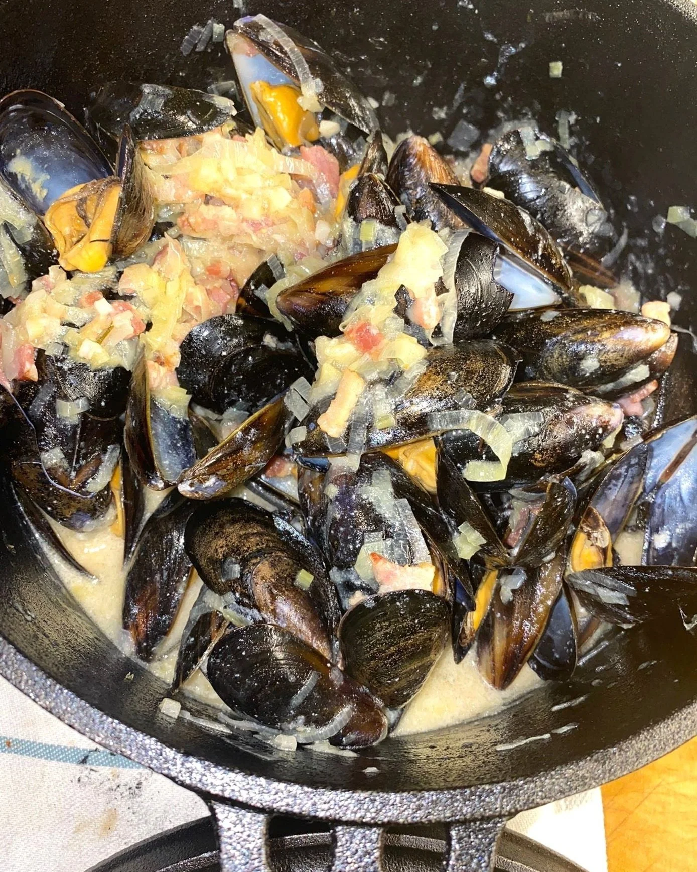 Stir through the double cream and parsley, check the seasoning, give a very good grind of black pepper. Discard any mussels that have not opened. Stir again, dish up with the juices and serve with some fresh crusty bread.