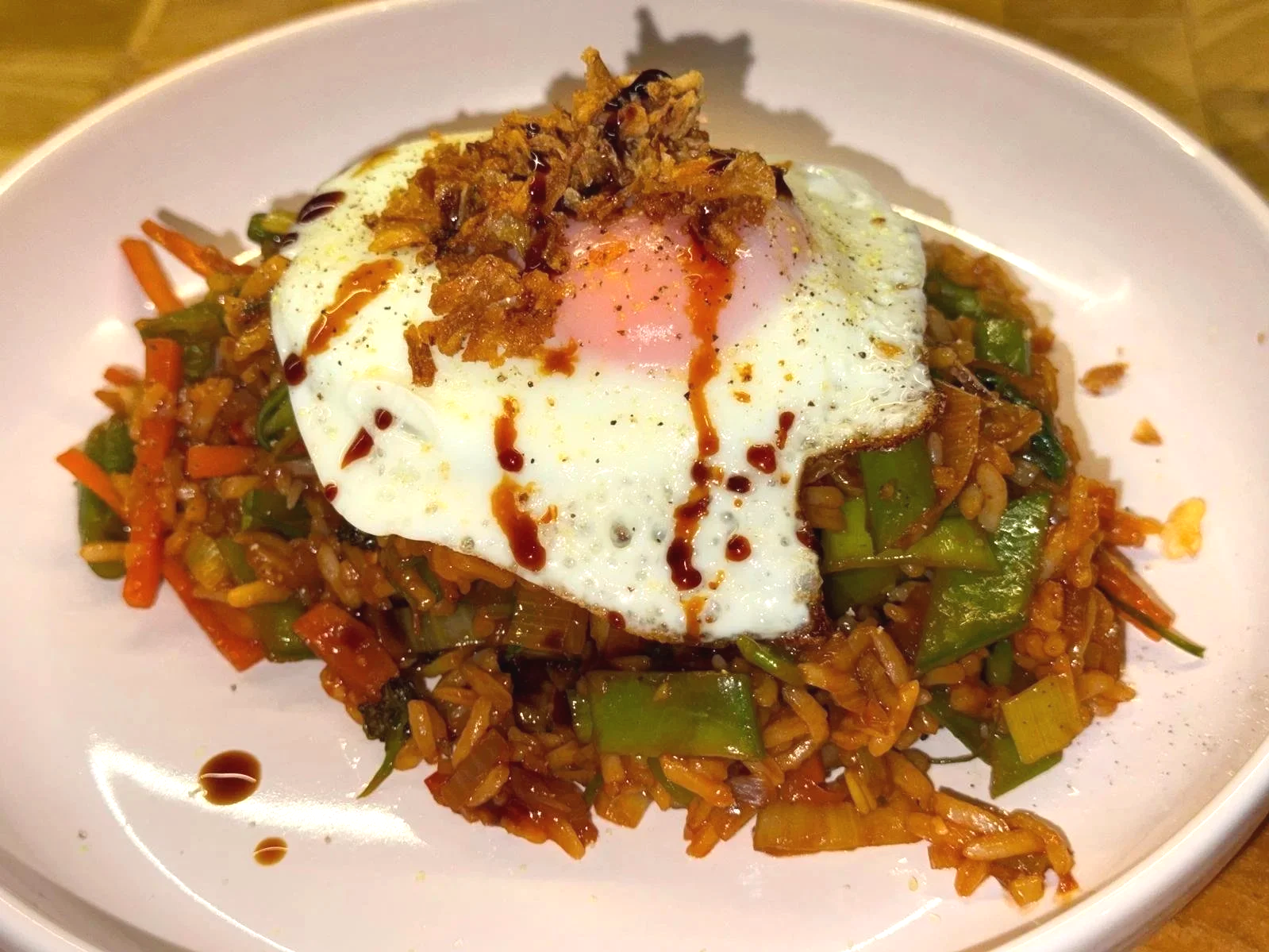 Once you dish up put a drizzle of kecap manis over the top along with some sambal and a sprinkling of crispy fried shallots.