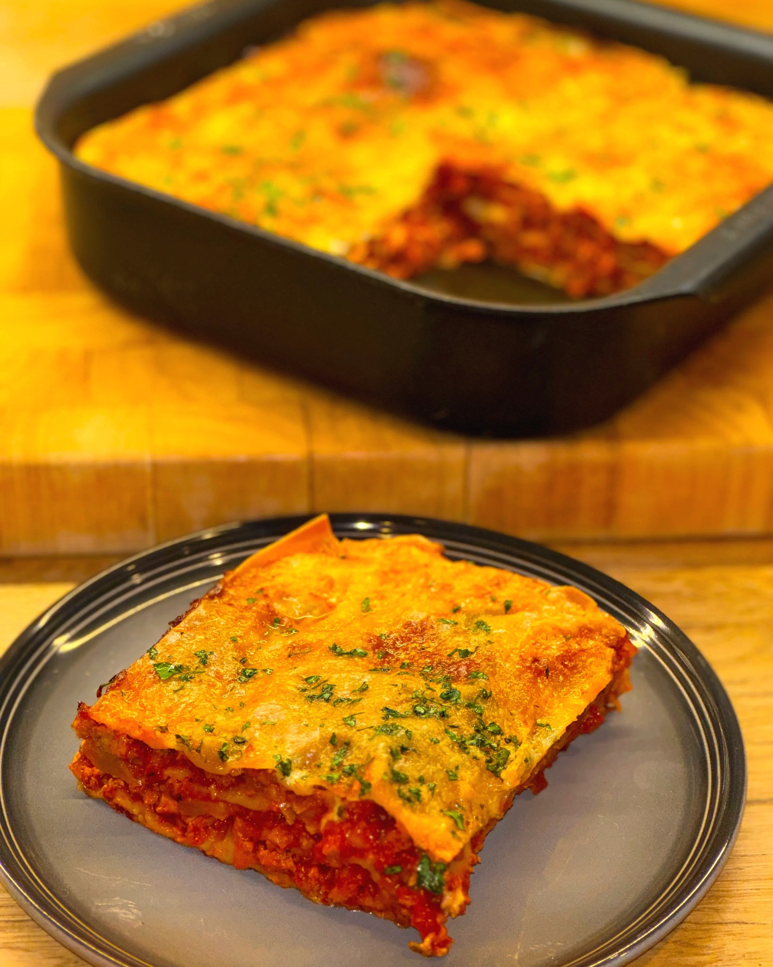 Before assembling, remove the pasta sheets from the packet and work out how many sheets you need per layer for your dish. We are aiming for 4 layers of sauce and 4 layers of pasta, you may need to cut your sheets to fit. I also take my spoon and ‘divide’ the sauce in the pan into 4 so I know how much sauce I have per layer.
