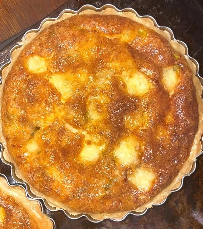After 15 minutes take the tart cases out of the oven and remove the beans and paper and reduce the heat to 180c. Put the cheese chunks over the base and then the leeks. Pour the egg mix into the base carefully until almost at the top. Top with the remaining cheese and bake for 20-30 minutes until they are golden.